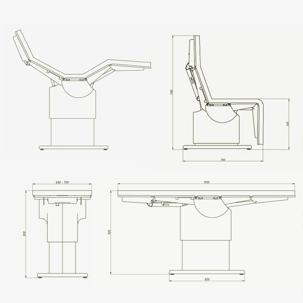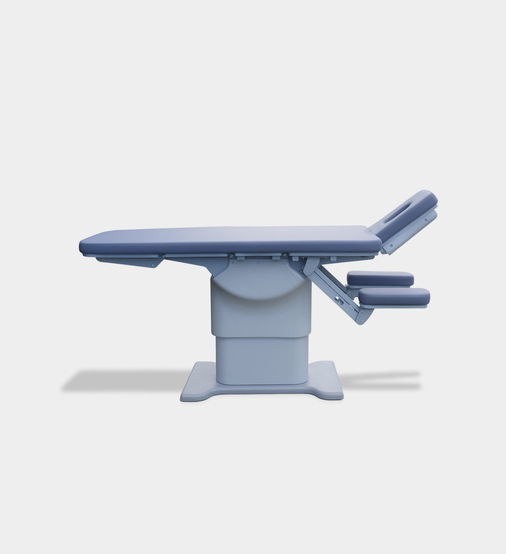 Пневмоприводы обеспечивают мгновенную настройку подголовника и подлокотников. Автоматический изгиб спинки при ее подъеме. Регулировка высоты от 60 до 92 см, управляется пультом или педалью. Антибактериальная обивка Bi-Elastic с ионами Ag (антибактериально, Oeko-Tex).