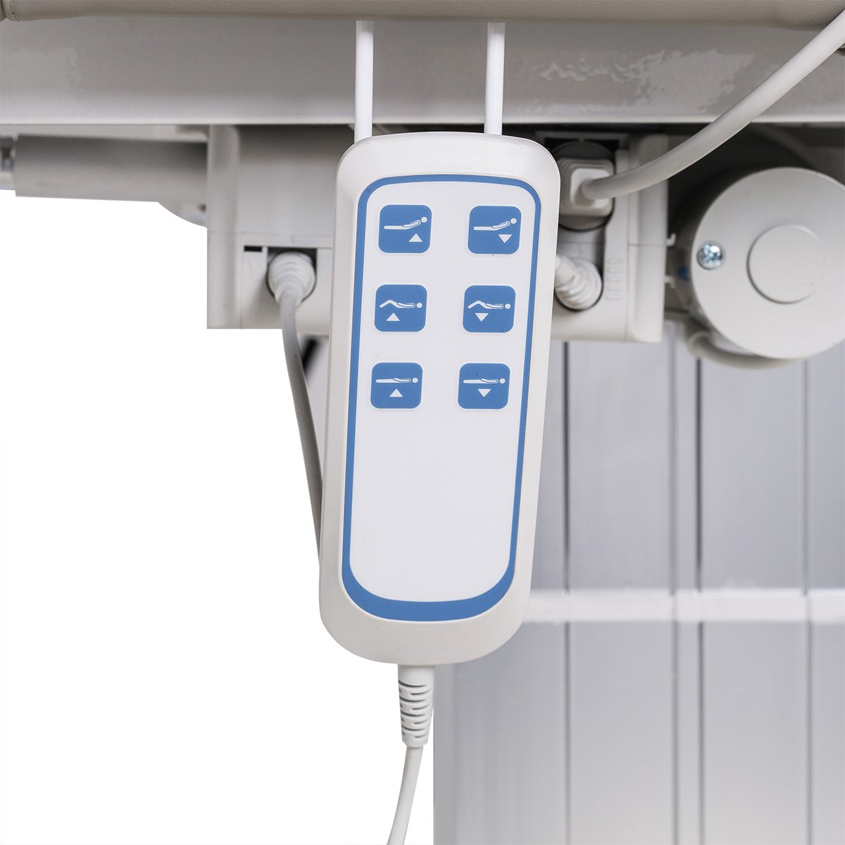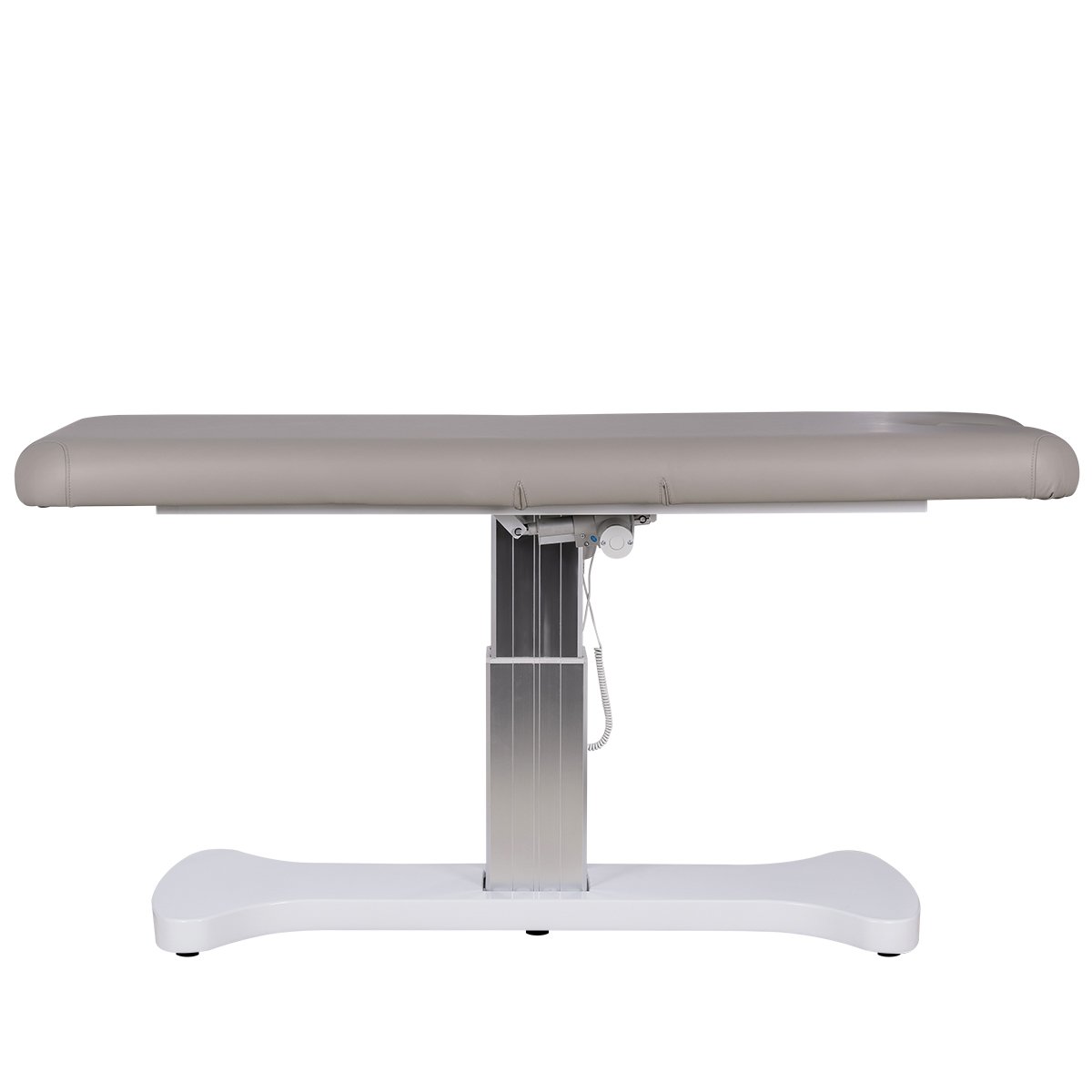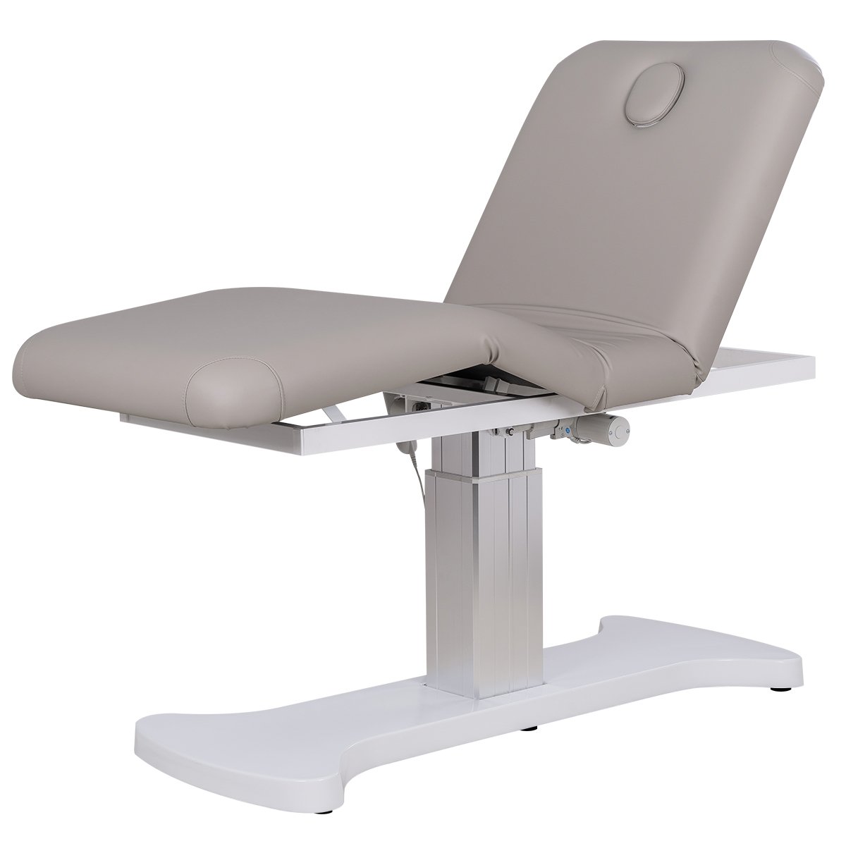В спинке имеется специальный вырез для лица, который при необходимости можно закрыть подушкой. Благодаря цельному ложу без секций, кушетка подходит для всех процедур сразу в трёх направлениях: косметология, спа и массаж. В наличии ручной или ножной пульт — по выбору.