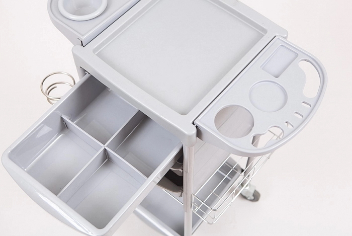 Парикмахерская тележка с навесными панелями, металлическим держателем фена и съёмной нижней корзиной. Каркас тележки выполнен из хромированного металла, ящики и навесные элементы – из ударопрочного пластика. Конструкция установлена на больших свободно вращающихся колесах.Характеристики:
