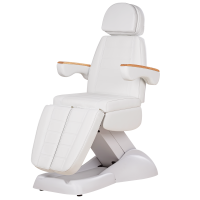 Кресло оснащено прочным и широким основанием, его конструкция полностью раскладывается в горизонтальное положение. В комплекте имеется выдвижной подголовник с отверстием для лица, которое можно закрыть мягкой подушкой, а также съемные подлокотники с элегантными деревянными вставками.