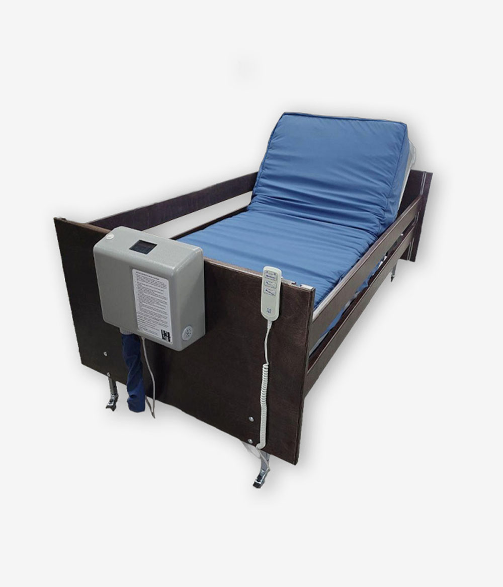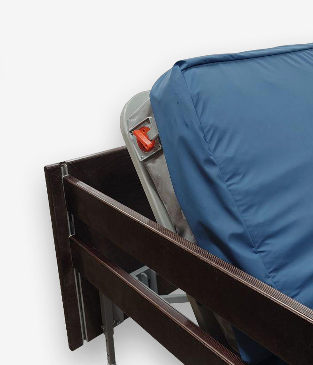 Эта кровать оснащена механизмом подъема спинки, который одновременно вытягивает матрас Такая конструкция предотвращает сползание пациента и уменьшает трение мягких тканей о поверхность матраса, обеспечивая дополнительный комфорт и безопасность.